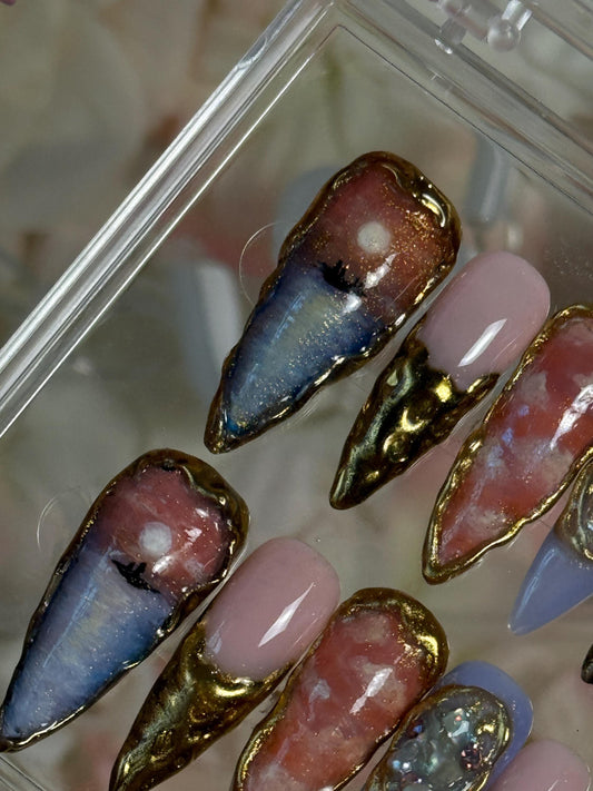Monet Inspired Gold Sunset Oil Painting- Reusable Press on Nails
