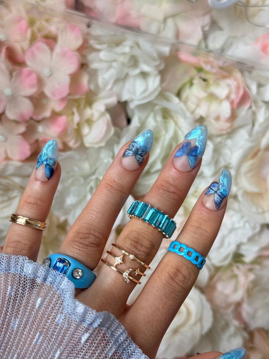 Irredescent Whimsical Holo Blue Butterfly Fairy Garden Cottagecore Inspired Reusable Press on Nails